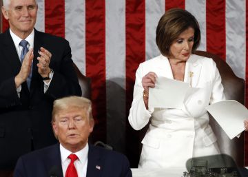 La noche empezó ruda. Donald Trump subió a la tribuna de la Cámara de Representantes para pronunciar el anual discurso del estado de la Unión, una de esas fechas cumbre de la agenda de un mandatario estadounidense, y negó el saludo a la presidenta de la Cámara y tercera autoridad de la nación, Nancy Pelosi. El republicano se dirigía al país en unas circunstancias excepcionales, a un día de recibir el veredicto —previsiblemente absolutorio— en el juicio político por el escándalo de Ucrania impulsado por los demócratas, con Pelosi a la cabeza. A partir de ahí, durante una hora y 18 minutos, el presidente hizo lo más parecido a un mitin de sello trumpista, presumiendo de economía, sacudiendo a la inmigración y con toques de show televisivo. Al terminar, Pelosi rompió los folios del discurso de Trump con evidente desprecio. Cuando la prensa le preguntó después por qué, la veterana política respondió: “Porque era algo cortés considerando la alternativa. Qué discurso tan sucio”.