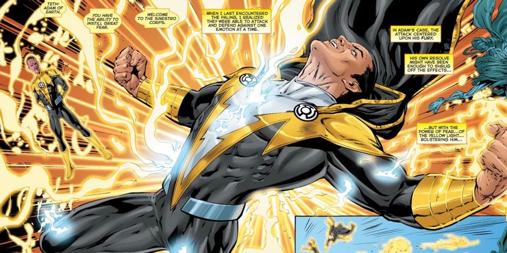 Deslizándose en el dedo de Black Adam, el anillo amarillo del miedo transforma el disfraz de Adam de su habitual atuendo negro y dorado, adornado con rayos, en algo similar, pero mucho más visualmente interesante. Cambiando los adornos dorados por amarillos, el símbolo del pecho blanco de Black Adam se expande desde su pecho hasta el cuello, con su capa unida a sus hombros a través de dos nuevos símbolos manifestados de Sinestro Corps. Además, la nueva apariencia de Adam agrega un cinturón teñido de azul, los acentos amarillos en forma de V de Sinestro para resaltar su transformación e incluso un aura de color específica de Yellow Lantern alrededor de su cuerpo, completada por su anillo de poder recientemente adquirido que brilla intensamente en su mano.