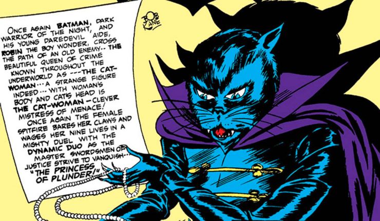 Selina Kyle ha tenido muchos disfraces a lo largo de su historia de cómics, incluido un disfraz morado con una capa verde. Antes de que el escritor Bill Finger la caracterizara como el interés romántico de Batman, se la representaba como una ladrona común. Apareciendo inicialmente en ordenanza #1 (1940), reveló su disfraz de gato en ordenanza #3 titulado “The Cat-Woman”, escrito por Finger con arte de Bob Kane. Conocida simplemente como “la gata”, la versión inicial de Catwoman ni siquiera era conocida por su alter ego, Selina Kyle.