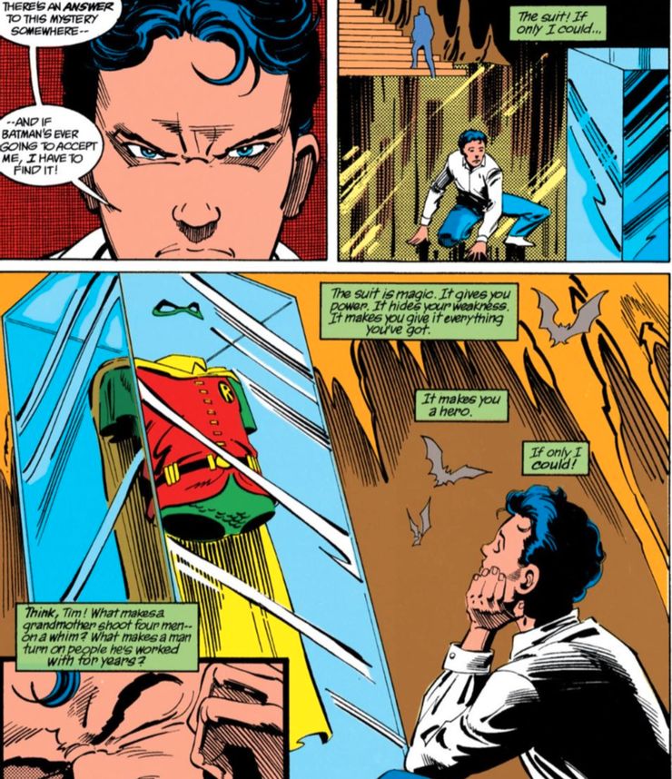En ordenanza #456 por Alan Grant, Norm Breyfogle, Steve Mitchell, Adriene Roy y Todd Klein, Tim Drake pasa la Nochebuena ayudando a Batman a resolver un misterio para demostrar su valía de ser el próximo compañero de Batman. Se angustia por no poder resolver el caso y pasa las vacaciones en la Baticueva con el disfraz de Robin colgando sobre su cabeza. Está claro que para Tim, el disfraz no es solo una forma de proteger su identidad como luchador contra el crimen. El detective adolescente idolatra lo que representa y dice que “El traje es mágico. Oculta tu debilidad. Te hace dar todo lo que tienes.“y dice marcadamente que el traje”te convierte en un héroe”.