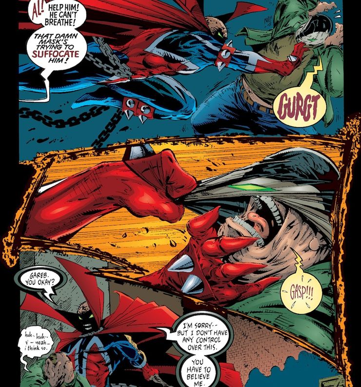 Aunque Gareb solo la tuvo puesta por unos momentos, la máscara de Spawn casi lo asfixia antes de que Al pudiera quitársela, a lo que este último se disculpó profusamente, citando que no tenía idea de que tal cosa sucedería. Aunque Gareb se sacudió la experiencia cercana a la muerte con humor, este ejemplo fue uno de los primeros ejemplos de que el peligro de Spawn no terminó simplemente con él. Si bien finalmente aprendió a comprender y controlar mejor sus poderes (Spawn incluso obtuvo los poderes de Superman por un tiempo), no minimizó la amenaza general. Aparecer representado como incluso su disfraz no debe ser subestimado, fácilmente provocado a la violencia y listo para atacar incluso a aquellos considerados aliados si se considera peligroso.
