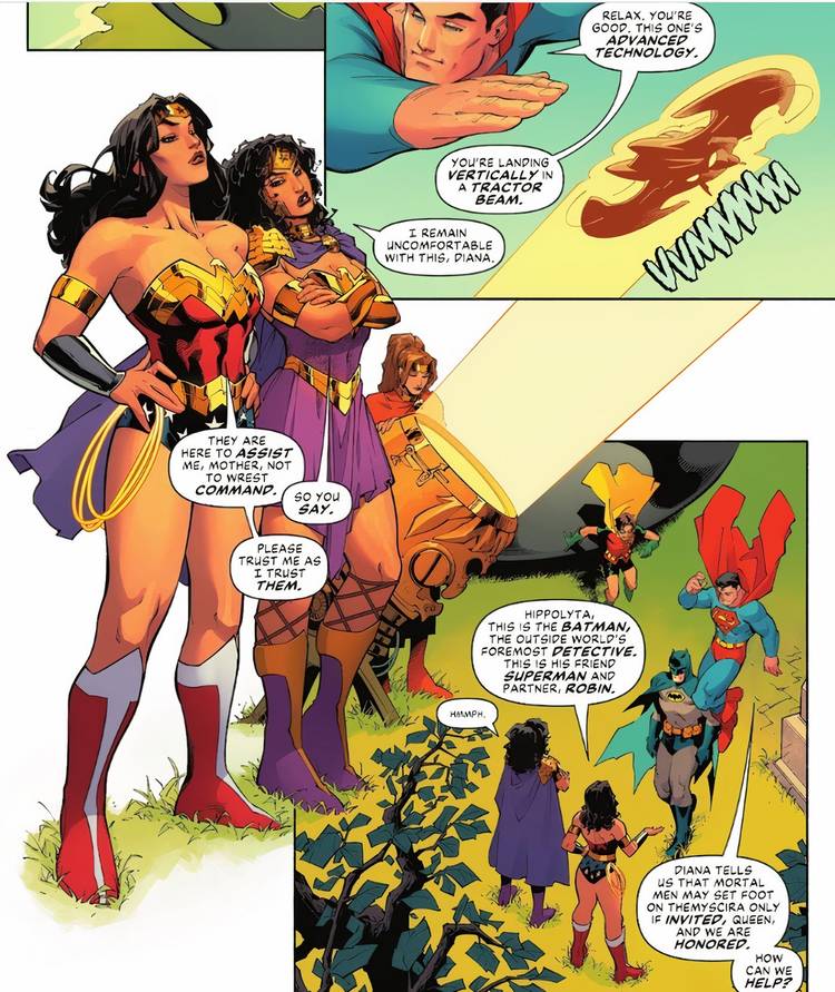 Al igual que el resto de la serie, este número se centra en los primeros días de Superman, Batman y Robin (Dick Grayson), lo que hace que la incorporación de Diana al equipo sea particularmente emocionante, ya que marca la primera misión de Trinity juntos. Junto con la emoción de este icónico equipo, Los fanáticos pueden disfrutar de un regreso nostálgico de la Princesa Amazona con su vestuario diseñado por George Pérez.—uno de sus mejores looks, en mi opinión.