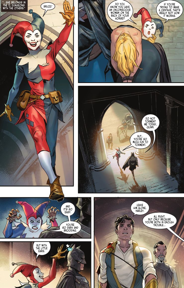 Esta historia de fantasía de Tom Taylor y Yasmine Putri tiene a los padres de Superman haciendo el viaje desde un Krypton moribundo, solo para aterrizar en una tierra de la era de la Edad Media. Sus poderes desarrollados rápidamente les permiten crear un nuevo reino en décadas, con Jor-El y Lara como Rey y Reina, y Clark como su príncipe. Bruce Wayne protege el reino y Clark como el bastardo Bat-Príncipe, asistido por su legión de Robins. Después de un intento casi desastroso de derrotar a una banshee local (Canario Negro de este mundo), Harley, con un atuendo familiar, espera para recibir a los héroes que regresan. No pierde el tiempo en hacer el trabajo de un arlequín y toma a la ligera la desventura. Ella se burla alegremente de Bruce, burlándose de su actitud seria junto con su atuendo poco convencional. Pero la alegría y la alegría no son sus únicas formas de comunicarse, y ella le informa diligentemente a Clark que sus padres lo convocan.