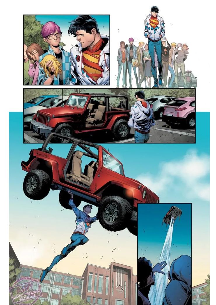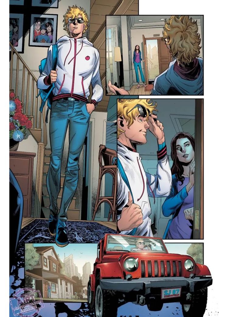 AIPT Comics ha lanzado exclusivamente nuevas páginas de vista previa para Superman: Hijo de Kal-El # 2 por Tom Taylor, John Timms y Gabe Eltaeb. La vista previa muestra al nuevo Superman luciendo una peluca rubia y gafas de sol. Su disfraz es absolutamente terrible y dolorosamente obvio. Cualquiera en la calle miraría su cabello y se daría cuenta de que es una peluca. No es una sorpresa que su identidad como Superman sea descubierta antes de que llegue a la universidad. Parece que Jonathan es atacado por un asaltante, ya que en la segunda página de vista previa su sudadera blanca está hecha jirones.
