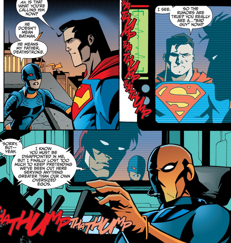 El ex Boy Wonder subestima a Deathstroke, lo que lleva a una pelea con Superman que pone en peligro a los inocentes. Deathstroke es el adversario más mortífero de Nightwing, por lo que no sorprende que Dick Grayson desconozca las modificaciones introducidas en su disfraz, así como las adiciones hechas para Ravager. Uno de los guantes de Grayson contiene un dispositivo que desvía la señal de su corazón. Como resultado, los sentidos de Superman lo convencen de que Dick está diciendo la verdad, lo que lo hace caer en una mentira obvia que sus propios instintos deberían haberle dicho que no era verdad.