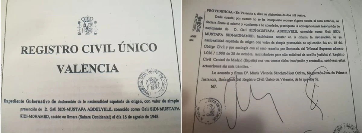El líder del Frente Polisario, Brahim Gali, es ciudadano español desde diciembre de 2004. En esa fecha, la magistrada del Registro Civil de Valencia, donde entonces residía, ordenó la inscripción de la “nacionalidad española de origen con valor de simple presunción” (una fórmula prevista para los nacidos en España de padres extranjeros y que no tengan otra nacionalidad) de Gali Sidi-Mustafa Abdelyelil. Lo hizo en aplicación del artículo 18 del Código Civil, que permite consolidar la nacionalidad a quien la haya utilizado durante al menos 10 años de buena fe.