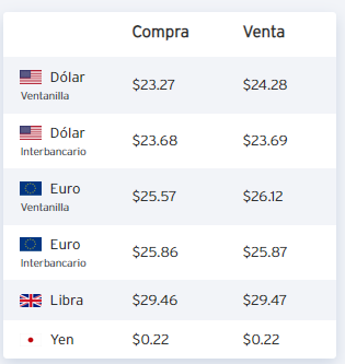 Mientras que el dólar al mayoreo para transacciones entre bancos, empresas o gobiernos, se vende a $23.69 pesos y se compra a $23.68 pesos.