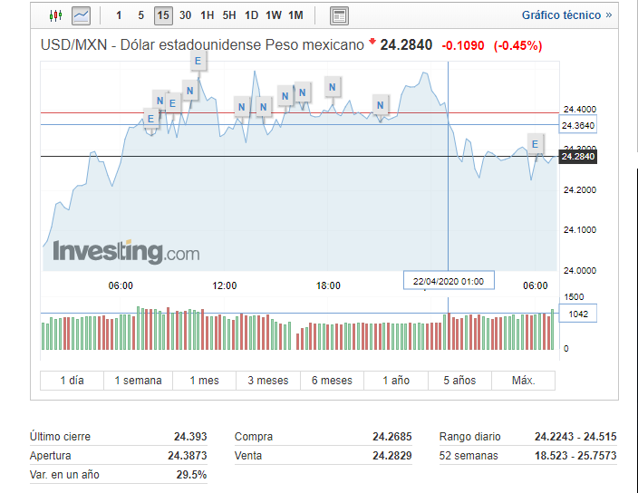 El dólar se cotiza este 22 de abril en un promedio de $24.28 pesos.