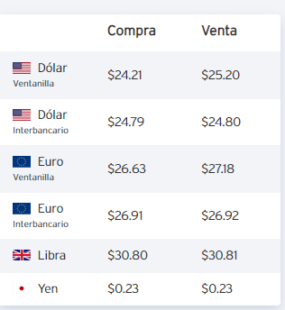 Mientras que en las ventanillas de BBVA, el billete verde se vende al menudeo en $25.06 pesos y se compra en $24.16 pesos.