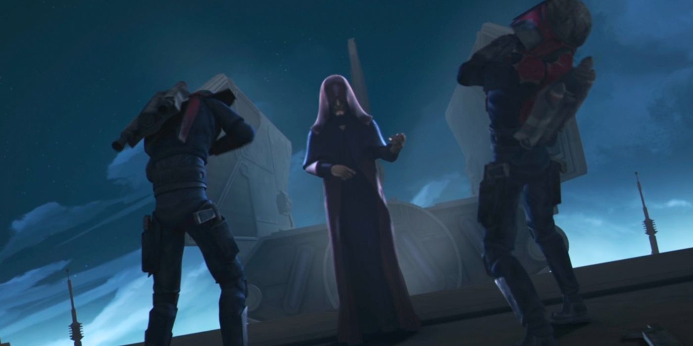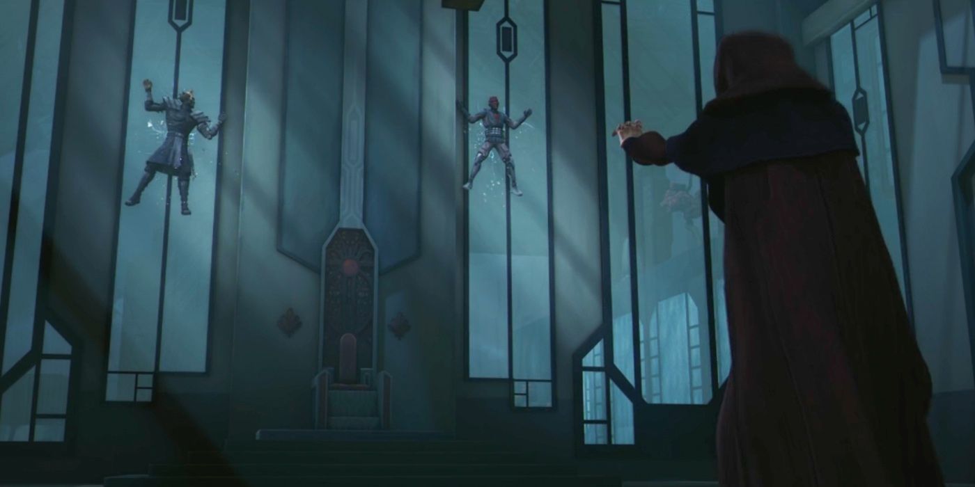 Cuando Palpatine llega por primera vez a Mandalore en Las Guerras Clon En la temporada 5, episodio 16, se encuentra rápidamente con dos de los nuevos soldados mandalorianos de Maul que vinieron de la Guardia de la Muerte, la pequeña fuerza de mandalorianos que todavía se adhería a las costumbres guerreras del planeta a pesar de la postura pacifista y neutral del mundo durante las Guerras Clon. De todos modos, Palpatine se deshace de ambos sin esfuerzo, apenas levantando la mano para estrangularlos a ambos usando la Fuerza. Si bien el estrangulador de la Fuerza es uno de los poderes de la Fuerza del lado oscuro más clásicos utilizados con mayor frecuencia por Darth Vader en el Guerra de las Galaxias Canon, el movimiento parece aún más simple cuando lo realiza Palpatine en esta secuencia de apertura.