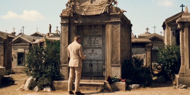 Incluso hay un huevo de Pascua muy importante en esa tumba que Bond visita en Matera. Sobre la tumba de Vesper, nunca le damos mucha importancia, no hay foco en ella, pero para cualquiera que regrese, dos esqueletos sostienen una pancarta tallada en piedra. Es una frase en latín que Mark y yo habíamos visto en la basílica principal donde se encuentra el puente. La frase dice: ‘Lo que eres tú, lo fui una vez, y lo que soy, él se convertirá’. Así estaba escrito en el principio.