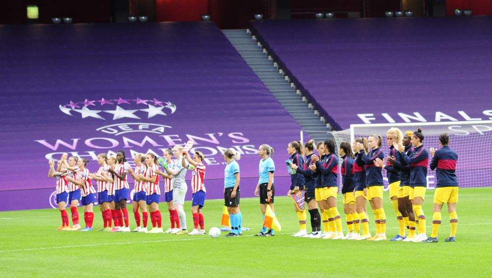 No volvió a sonar el himno de la Champions en el nuevo estadio rojiblanco. Al contrario. La seriedad del momento imperó a nivel protocolario. Primero salió el equipo arbitral al césped, después el Atlético y más tarde el Barça. Fotos de rigor y minuto de silencio compartido en círculo en el centro del campo en memoria de los fallecidos por el coronavirus.