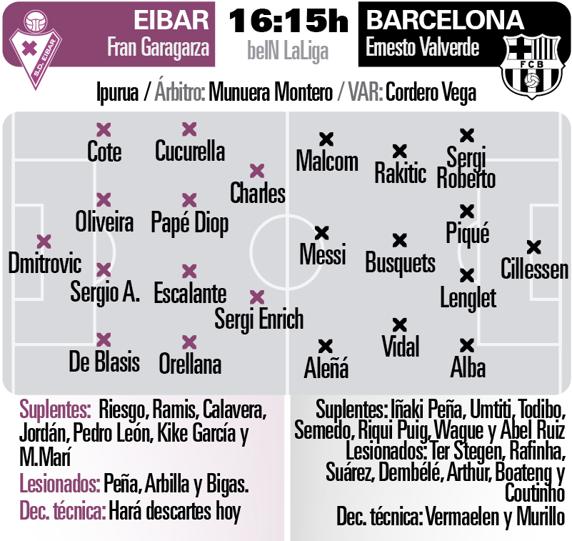 El ‘once’ del Eibar puede llegar a ser una incógnita. El de Zaldibar tiene la posibilidad de intentar cerrar por todo lo alto la temporada y apostar por sus más utilizados guerreros o, por su parte, dar entrada a los menos empleados que tienen contrato para el año que viene para ir preparando la próxima campaña. Jugadores como Calavera o Pedro León, que por diferentes motivos han estado mucho tiempo fuera de los terrenos de juego, podrían tener cabida en la alineación local. Lo que parece que no va a cambiar es la zaga. De Blasis es el lateral derecho reconvertido que se ha inventado Mendilibar para sustituir a Rubén Peña. En los centrales, Sergio Álvarez, también reconvertido, y Oliveira parecen ser los encargados de parar a Messi y compañía hoy. Cote es un fijo en el lateral con sus constantes subidas y centros.