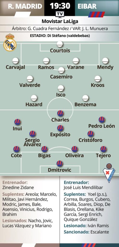 El campo Alfredo di Stefano poco o nada tiene que ver con el Santiago Bernabéu, del mismo modo que Valdebebas no desprende el glamour que se percibe habitualmente en Concha Espina. Sin embargo, al Eibar se le puede poner muy cuesta arriba el partido contra el Real Madrid hoy, a partir de las 19.30 horas, en la ciudad deportiva blanca, si no consigue dar con las teclas adecuadas en el reencuentro con la competición oficial. La nueva normalidad del fútbol, al menos hasta el 19 de julio, implica vaciarse sobre el verde en el silencio más absoluto. Sin público en las gradas, la concentración tiene que ser máxima y el esfuerzo, controlado ante el exigente calendario que les aguarda a los futbolistas.