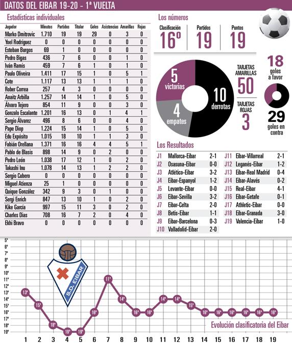 La falta de productividad en ambas áreas puede ser uno de los grandes debes del equipo, especialmente en lo que capacidad goleadora se refiere. El Eibar es uno de los seis equipos de Primera que no llega a un tanto por partido (suma 18 en 19 jornadas). Entre los cuatro delanteros del equipo suman seis goles, una cifra escasa.