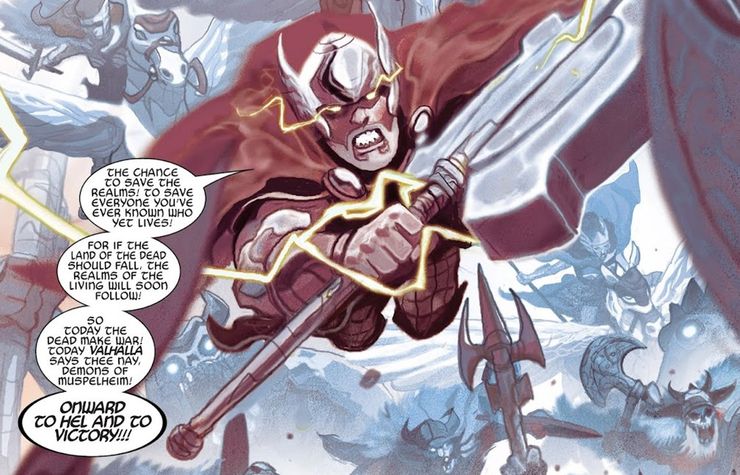en 2018 thor #4 por Jason Aaron y Mike Del Mundo, Thor hizo que Loki le lanzara un hechizo de muerte para engañar a las valquirias haciéndoles creer que Thor estaba muerto. Entonces podría obtener acceso a Valhalla, la tierra de los guerreros que habían caído en la batalla. La ubicación de Valhalla estaba oculta y Thor sabía que la única forma de llegar allí era estar muerto él mismo. Una vez que llegó allí, Thor pudo convencer a estos héroes caídos de que los necesitaban para detener la invasión de Sinr. Juntos, regresaron al campo de batalla y lograron hacer retroceder a Sindr.