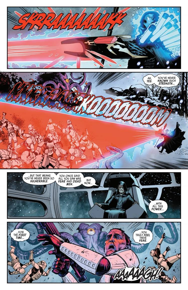 en marvel Darth Vader#50 Por Greg Pak y Raffaele Ienco, Vader finalmente tenía todo el poder necesario para actuar contra su maestro. Armado con un bastón eléctrico kyber y un escudo de kyberita para canalizar la Fuerza de manera única, la fuerza de Vader también aumentó gracias al poder proveniente de la fuerza vital drenada de todo un planeta. Como tal, Vader destruye a todos los Stormtroopers y cultistas Sith Eternals que Palpatine envió para derribar a su aprendiz. Sin embargo, Todo el enfrentamiento entre Vader y el Emperador fue parte del diseño de Palpatine, incluido un momento clave en el que el maestro de Vader evoca una línea clave de su pasado: