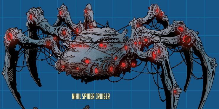 En el último número, Nihil atacó a la gente en Trymant IV y los Jedi llegaron para intentar salvar el día. En este planeta, se puede ver una máquina gigante con forma de araña. En el número más reciente, se revela que es el barco de Nihil: un crucero araña Nihil. Parece exactamente lo que sugiere su nombre. Una página de presentación con los nuevos barcos en Las aventuras de la Alta República proporciona más detalles sobre el barco.