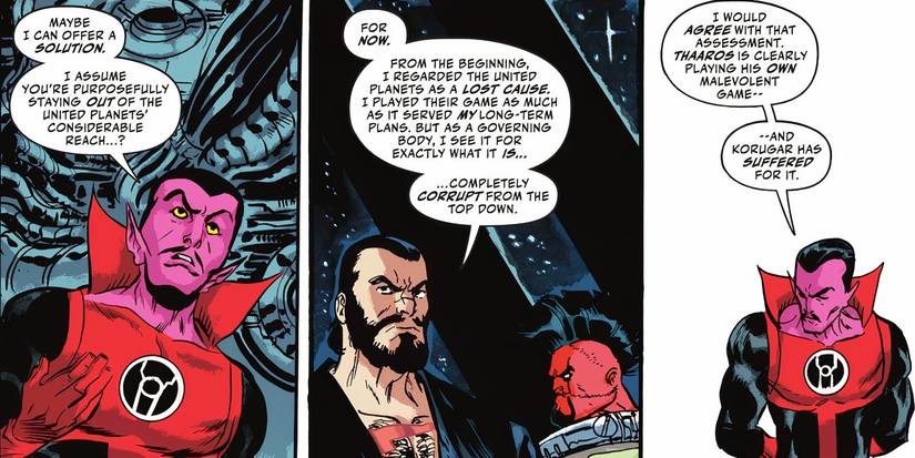 Sinestro está de acuerdo y dice que Thaaros está jugando un “juego malévolo” y que su mundo natal, Korugar, ha sufrido mucho por ello.