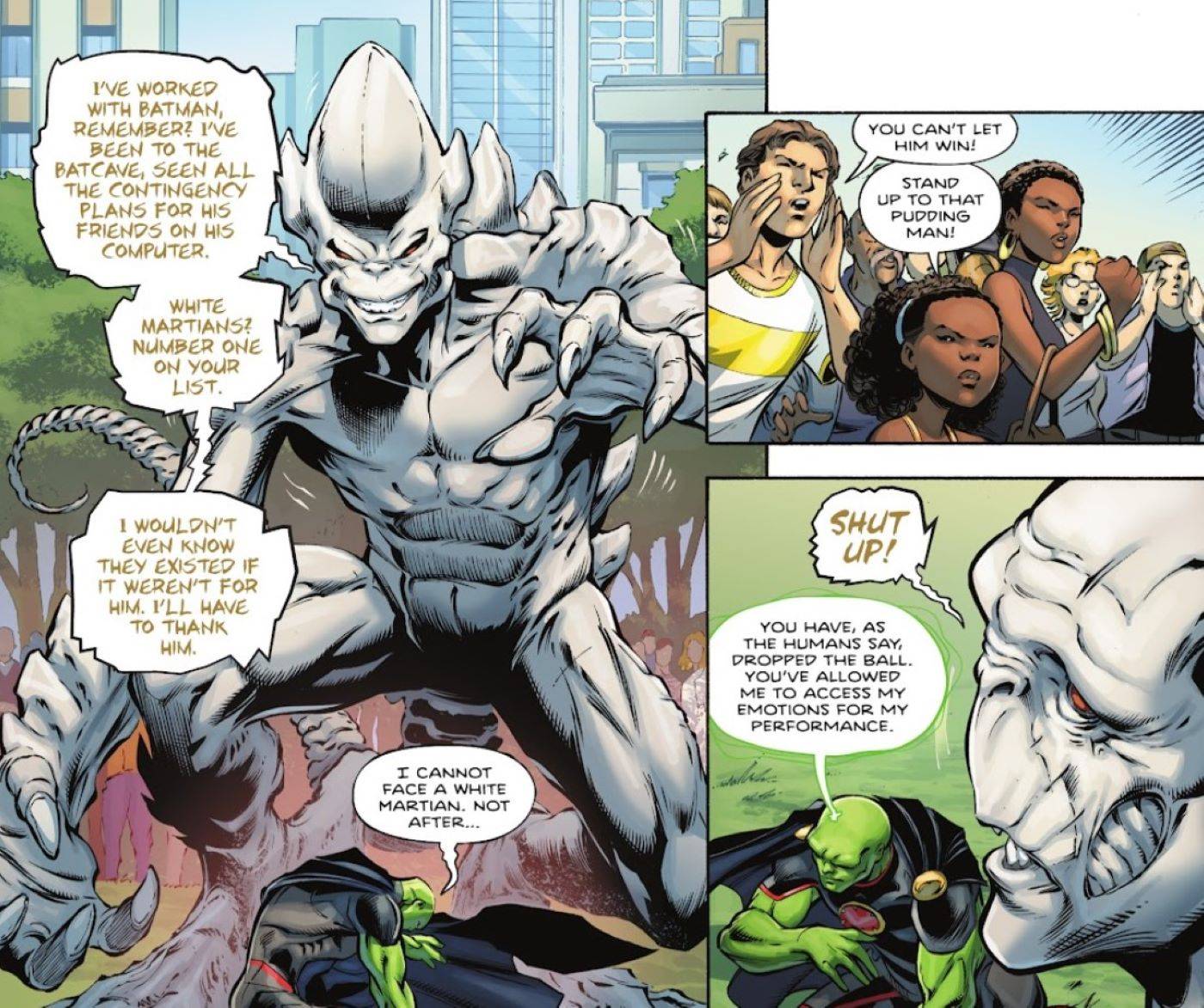 Clayface, que cambia de forma a un marciano blanco, el principal adversario de Martian Manhunter, revela que ha trabajado con Batman e incluso ha estado en la Baticueva, lo que le otorga acceso encubierto a todos los planes de contingencia del Caballero Oscuro para la Liga de la Justicia. En consecuencia, gracias a la ayuda involuntaria de Batman, Clayface conoce bien las estrategias más efectivas para derrotar a J’onnz y los demás miembros de la Liga. Explica además que ni siquiera habría sido consciente de la existencia de los marcianos blancos si no fuera por Batman y sus planes de contingencia.culpando directamente a Bruce por la situación actual de Martian Manhunter.