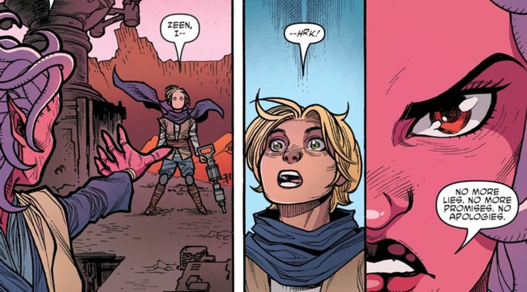 Pero en Star Wars: The High Republic Adventures # 5, de Daniel Jose Older y Harvey Tolibao, los Jedi reconsideran su decisión. Antes de este momento crucial, Zeen ha estado luchando por mantenerse en buenos términos con su amiga de la infancia Krix, quien se siente traicionada por el hecho de que Zeen decidió manejar la Fuerza, yendo en contra de todo lo que les habían enseñado mientras crecían. Cuando Zeen más tarde intenta encontrarse con Krix en la luna basura Quanxi de Ord Mantell, Krix derriba accidentalmente su barco y luego la deja en los restos en llamas después de recibir órdenes de retirarse del Nihil, un grupo de merodeadores con los que se había alineado. Esto llena a Zeen con tanta ira que pronto sucumbe a todos los sentimientos negativos que han estado burbujeando dentro de ella al usar primero Force Choke en él antes de que intervenga su amiga Padawan Lula Talisola, después de lo cual Zeen recurre a dispararle láseres a él. mientras trata de escapar.