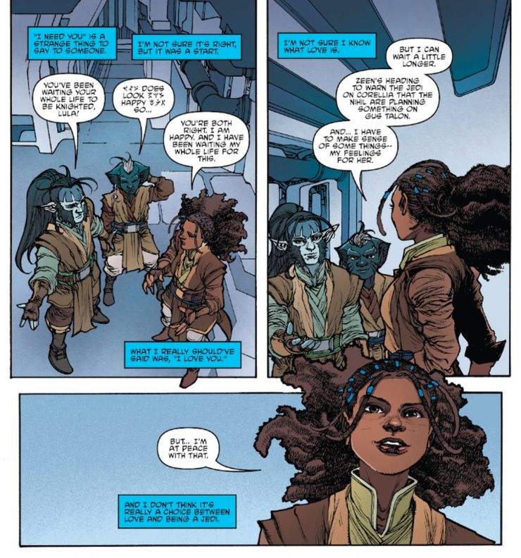 La filosofía de los Jedi podría haber sido defectuosa, pero Anakin Skywalker podría haber salido de sus límites en lugar de tratar de tenerlo todo en secreto. Ese punto se hace sutilmente a través de Lucasfilm Star Wars: Las aventuras de la Alta Repúblicade Daniel Jose Older y Harvey Tolibao, quienes han contado la historia de un romance Jedi LGBTQ+ que tuvo lugar unos 200 años antes de los eventos de Star Wars: Episodio I – La amenaza fantasma. La padawan Jedi Lula Talisola y el sensible a la Fuerza Zeen Mrala se están enamorando gradualmente, y ambos se están dando cuenta de la profundidad de sus sentimientos. Sin embargo, la diferencia crucial entre Anakin y Lula es que Lula es honesta acerca de sus emociones. En Star Wars: Las aventuras de la Alta República #13, le ofrecen ser nombrada caballero, pero decide que no está lista. “Todavía hay algunas cosas que necesito resolver antes de comprometer mi vida con la Orden Jedi.” ella admite a los Maestros, antes de agregar, “Tengo que darle sentido a algunas cosas: mis sentimientos por ella.Hay una marcada diferencia entre Lula Talisola y Anakin Skywalker, con Lula eligiendo la franqueza y la honestidad mientras que Anakin optó por el secreto.