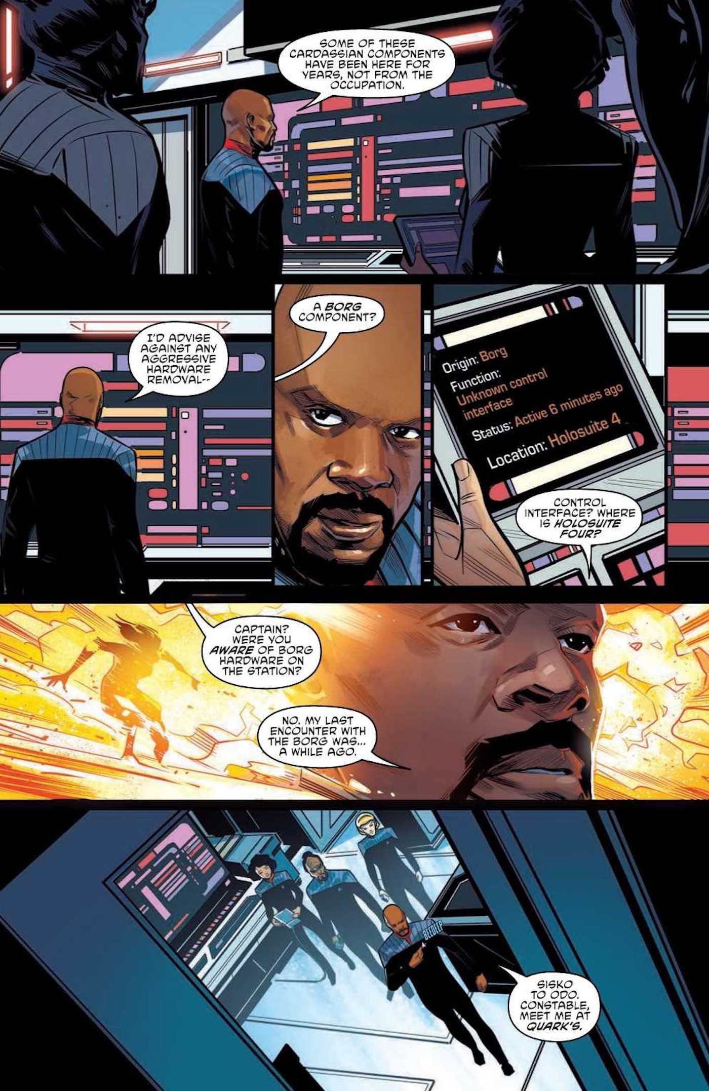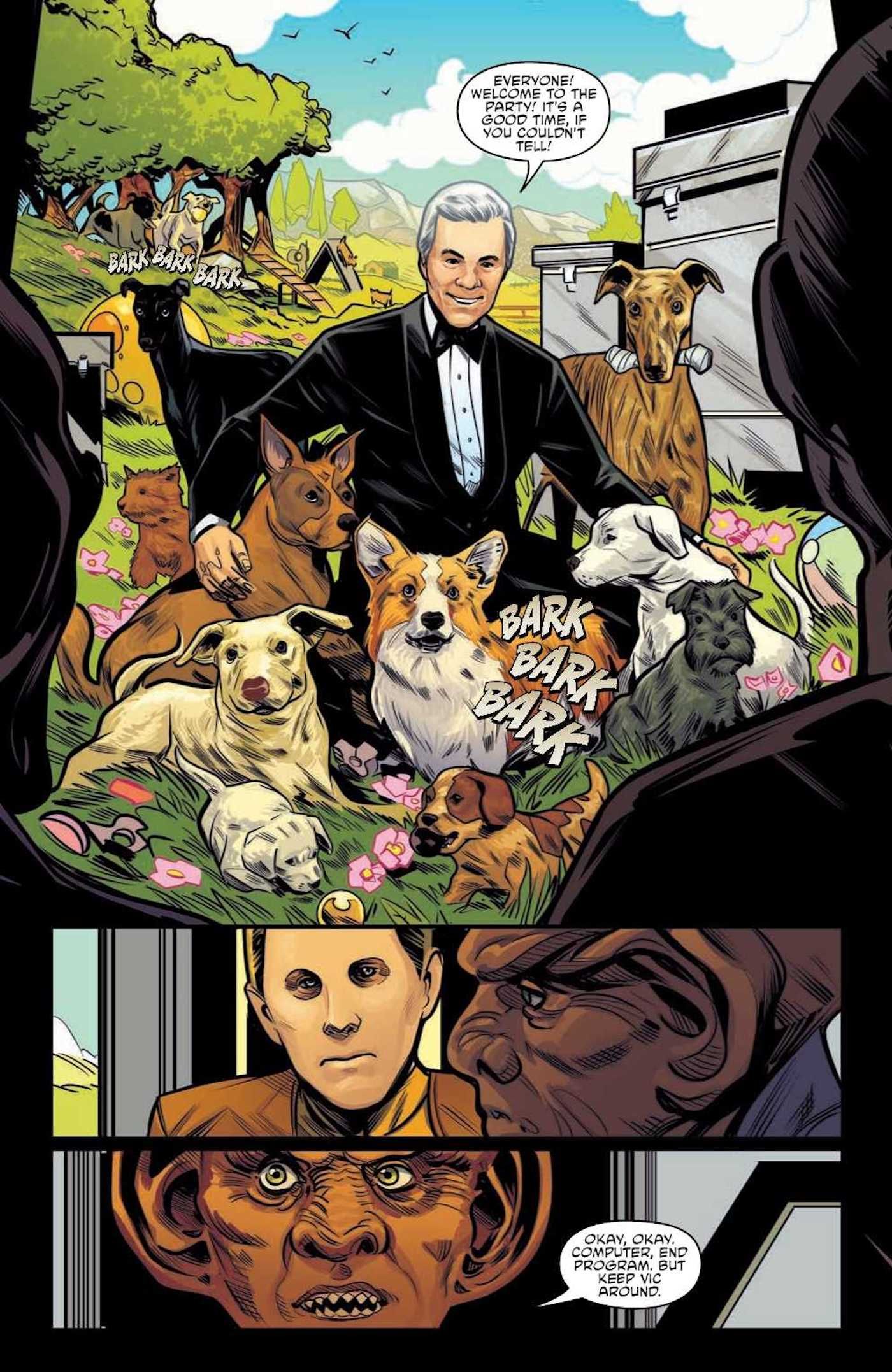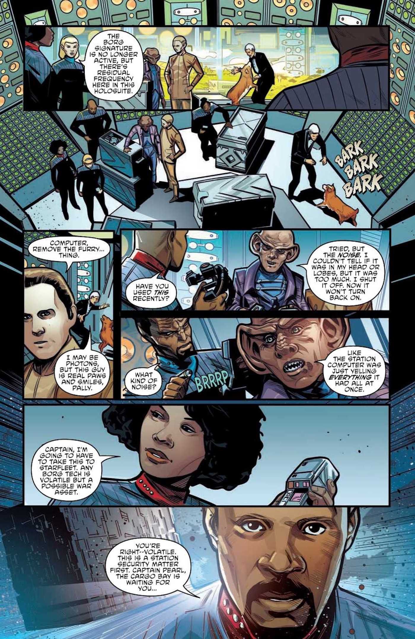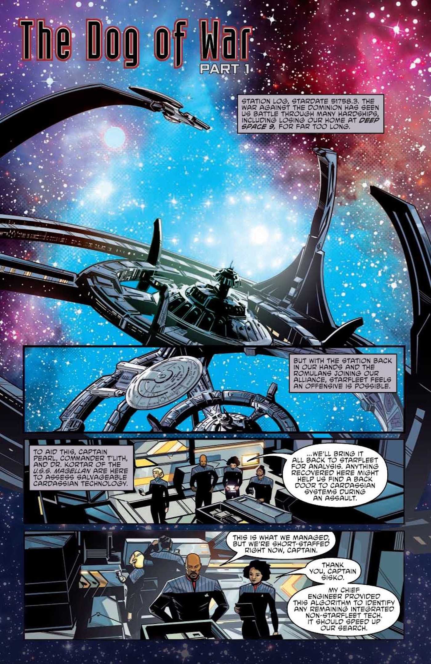 El número está escrito por Mike Chen, dibujado por Angel Hernandez, coloreado por Nick Filardi y rotulado por Neil Uyetake. Situado en el apogeo de la Guerra del Dominio, El perro de la guerra comienza cuando el Capitán Sisko descubre un componente Borg de contrabando a bordo de la estación. Sisko rastrea la tecnología Borg hasta una de las holosuites de Quark. Al entrar, Sisko descubre lo último que esperaba ver: Vic Fontaine, el cantante de salón holográfico, rodeado de perros. Sisko descubre el componente Borg en una caja de envío y se entera de que los drones lo utilizan para interactuar con el colectivo. Mientras tanto, los romulanos han entrado en la Guerra del Dominio del lado de la Federación, pero hay problemas para coordinar la estrategia, lo que resulta en grandes pérdidas. Sisko tiene una idea: usar la interfaz Borg como una forma de unir la flota y coordinar los ataques. Sin embargo, Sisko teme que usarlo podría sacrificar su humanidad. El problema termina con Sisko aceptando a regañadientes la idea de usar la interfaz.