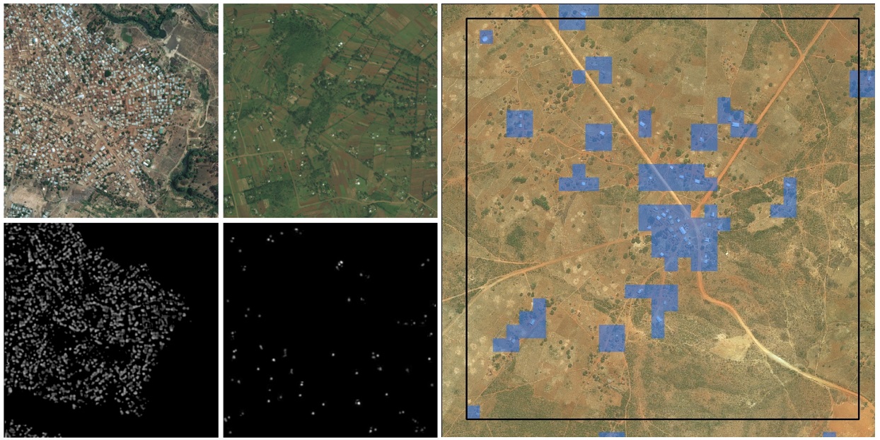 Los datos del mapa, dos imágenes de la parte superior izquierda, se procesan para encontrar edificios, dos de la parte inferior izquierda; en última instancia, grandes extensiones de tierra se pueden etiquetar como pobladas o no, como se ve a la derecha.