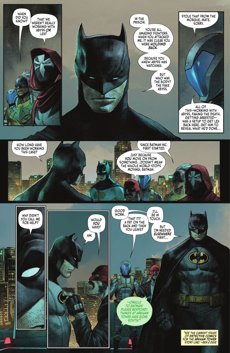 Abyss lidera la carga contra Batman y Luthor, pero justo cuando comienza la pelea, Batman dice: “Código: Club de Héroes” e instantáneamente los miembros de Batman Incorporated encienden Abyss. Los lectores aprenden que los miembros de Batman Incorporated Nunca se volvió rebelde, pero en su lugar estuvo trabajando profundamente encubierto para Batman todo el tiempo. Además, los miembros también trabajaron contra Luthor todo el tiempo. Una vez que Abyss fue derrotado y Luthor se enfurruñó, los miembros de Batman Incorporated reflexionaron sobre su futuro y su relación con Batman. El Caballero de la Noche regresa a Ciudad Gótica, pero asegura a sus antiguos empleados que estará en contacto.