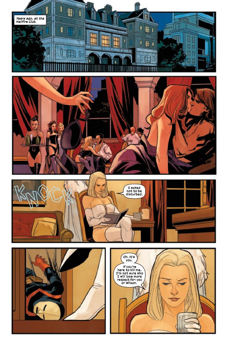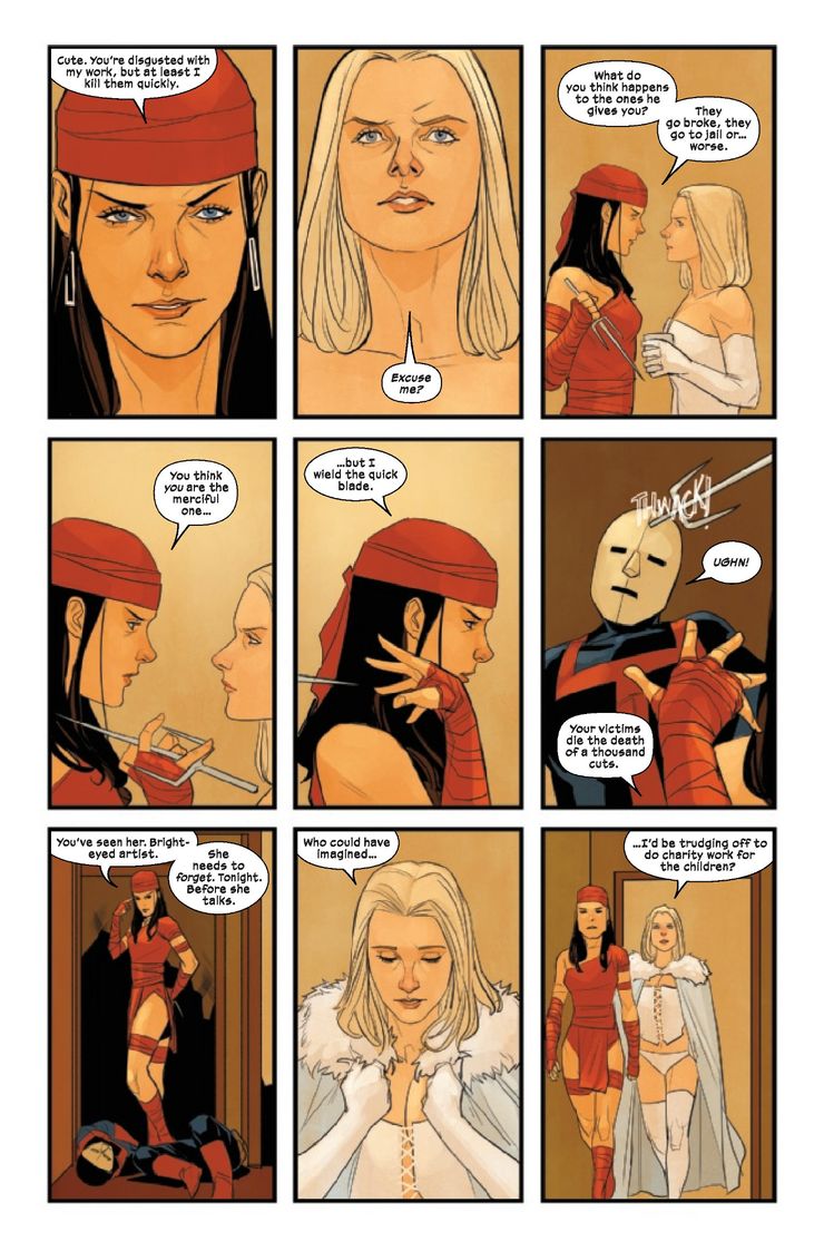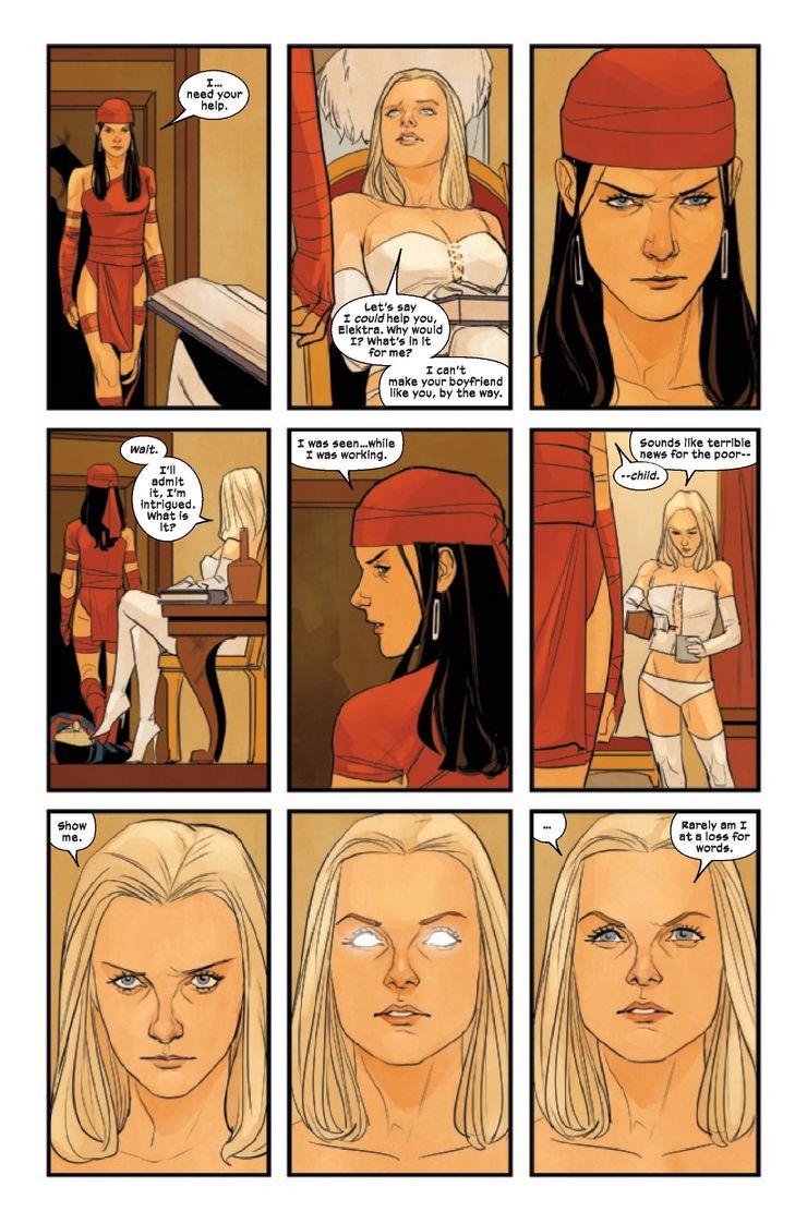 Durante uno de los trabajos de Kingpin, Elektra fue vista por una joven que estaba mirando por la ventana. Normalmente, Elektra se encargaría de cualquier testigo, pero no tiene el corazón para matar a un niño cuando hay otro recurso. la vista previa para Reinado del diablo: X-Men #2 muestra que tuvo que recurrir a un aliado poco probable para arreglar su error, Emma Frost, quien podría borrar fácilmente la memoria de la joven. Por lo general, Elektra mataría a cualquier testigo sin remordimiento, transmitiendo lo que aparentemente siente que es una muerte misericordiosa. Sin embargo, en el caso de un inocente, se ve obligada a pedirle ayuda a Emma, a pesar de que aparentemente la considera la villana más cruel. Quien finalmente es juzgado con más dureza depende de los fanáticos individuales, pero Elektra presenta un sólido argumento de que si la manipulación psíquica de Emma aún termina en muerte y ruina, es, con mucho, el camino más oscuro.