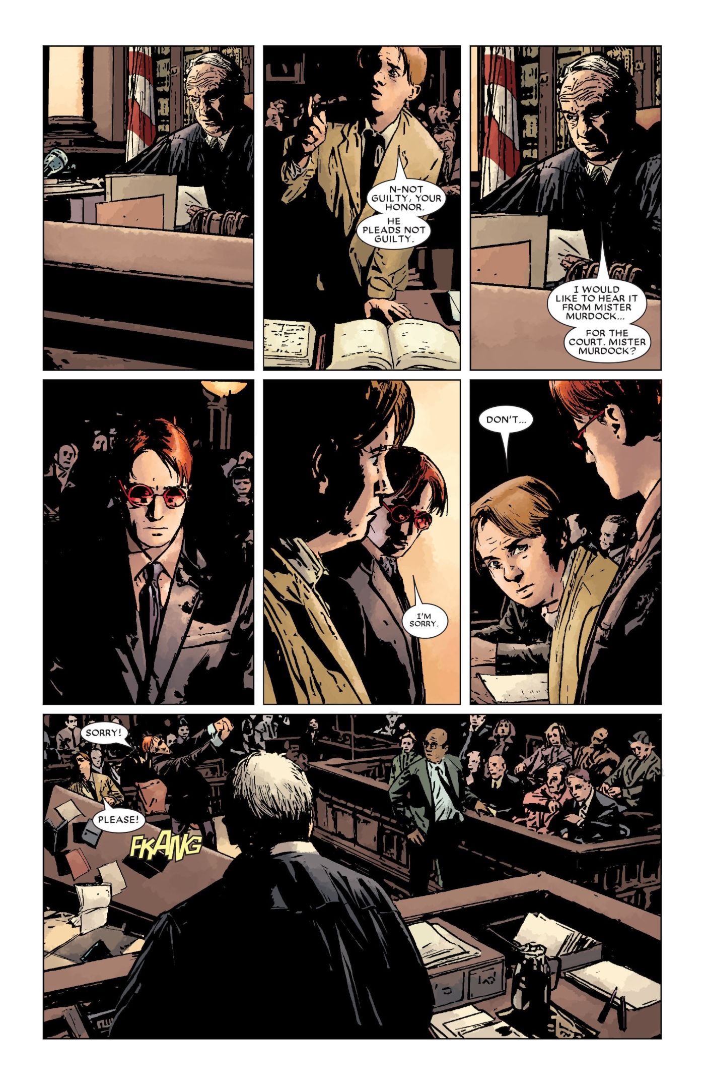 A lo largo de los cinco años de carrera de Brian Michael Bendis Temerario, Uno de los elementos principales de la trama general fue que se hiciera pública la identidad secreta de Daredevil. Matt tiene que lidiar con reporteros que lo acosan y villanos que lo atacan al azar de vez en cuando. Esto finalmente alcanza un clímax cuando el gobierno de Estados Unidos logra arrestar a Matt Murdock y juzgarlo por sus crímenes como justiciero. Todo esto se ve en Temerario #81 de Brian Michael Bendis y Alex Maleev, que muestra a Matt siendo llevado ante el tribunal y obligado a ser juzgado por violar la ley.