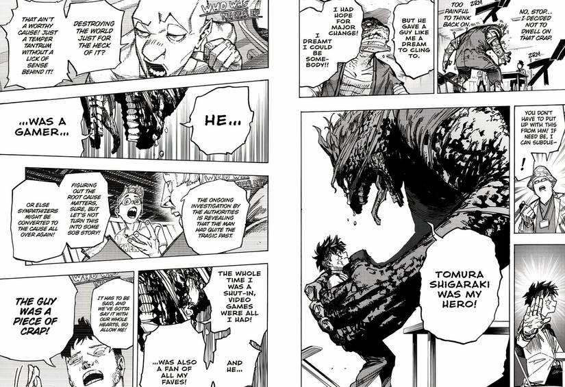 Spinner describe de forma desgarradora a Shigaraki como su rayo de esperanza y su héroe, mientras que, al mismo tiempo, los civiles de otros lugares lo describen como un monstruo que solo quería destruir. La parte más evocadora de la escena es cuando Spinner afirma que a Shigaraki le encantaban los videojuegos y los jugaba con él, lo que extrañamente lo humaniza y lo hace más atractivo. recuerda a los lectores una vez más la agridulce tragedia de su personaje.