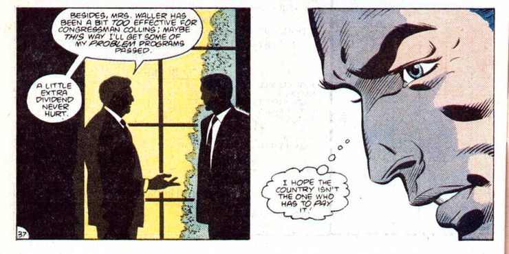 Esto significa que la mera existencia del Escuadrón Suicida fue en gran medida una maniobra política calculada basada en el miedo de Reagan a las actividades del Congreso de Waller, ya que era una forma de crear un súper equipo patrocinado por el gobierno. En un giro irónico (o quizás intencionado) de la política del mundo real, en el momento del lanzamiento del tema, la administración Reagan estaba envuelta en el Asunto Irán-Contra. Este escándalo mostró cómo Reagan y las personas que trabajaban a su alrededor no se mostraban tímidos ante las maniobras políticas extraviadas y turbias. Así que dar luz verde a un controvertido equipo de supervillanos con la esperanza de socavar a un oponente político es precisamente el tipo de tácticas en las que posiblemente habría participado el verdadero Ronald Reagan.