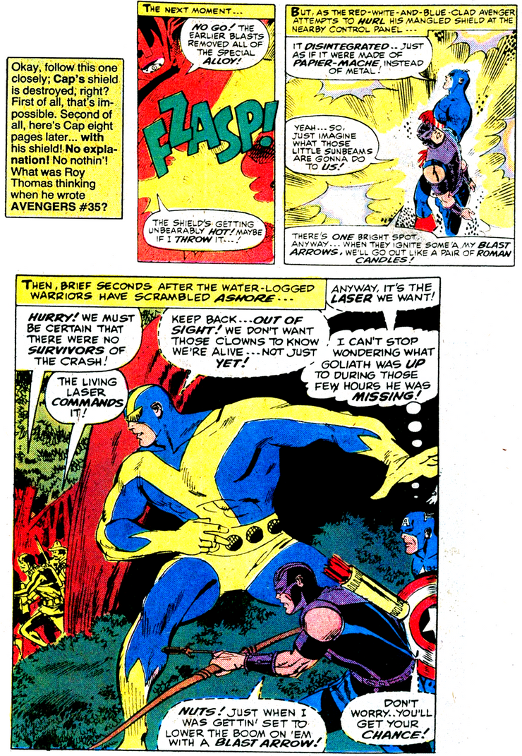 Uno de esos momentos tiene lugar en Vengadores #35, de Stan Lee, Roy Thomas y Don Heck, cuando una trampa tendida por Living Laser amenaza con matar al Capitán América y Hawkeye. Steve Rogers intenta salvarlos con su escudo, que en ese momento se presentó recubierto con una aleación protectora, y se destruye. Es un momento importante para el Vengador… o al menos debería serlo. Pero en lugar de llorar la destrucción de un escudo que sobrevivió a los rigores de la Segunda Guerra Mundial y sus décadas congelados en estasis, el Capitán América aparece un poco más tarde en los cómics con su escudo aparentemente intacto. Stan Lee recuerda el momento en 1983 Libro oficial sin premio de Marvel – una colección de errores accidentales de Marvel Comics hasta ese momento. Lee señala que no solo el escudo del Capitán América debería ser indestructible, sino que no se da absolutamente ninguna razón para que aparentemente se reconstituya solo unas escenas más tarde.