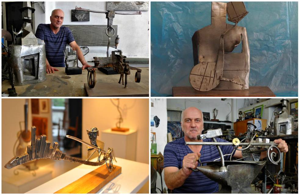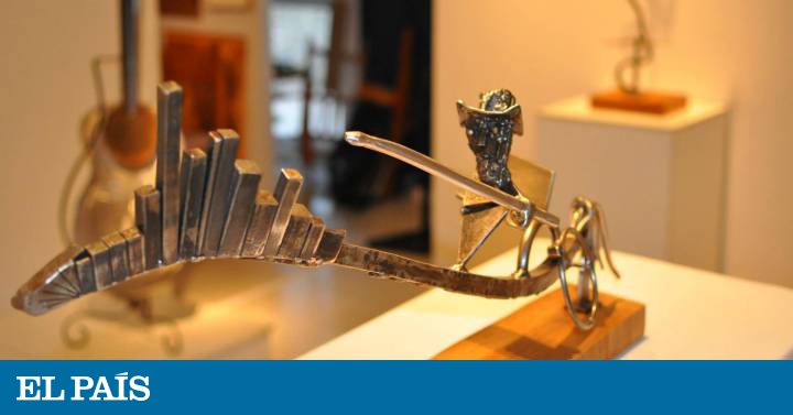 Influenciado por el barcelonés Julio González o por el italiano Alberto Giacometti, del que cuelga un retrato en sus paredes, Kamperidis viró hacia lo artístico. “En 2010 me puse a experimentar. Pero sin ningún estilo concreto: lo que salga, sale; si no me gusta, lo dejo”, aduce. A su alrededor se amontonan tallas de distintos tamaños y formas. Se adivina al caballero de la triste figura entre círculos de metal, perfiles enjutos o tiras rizadas como caballos galopando. También incluye a su escudero, Sancho Panza, o iconos de la península Ibérica como los toros. En una, la lanza sale del sombrero: “es una prolongación del cerebro”.