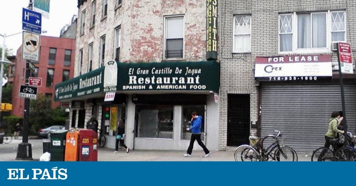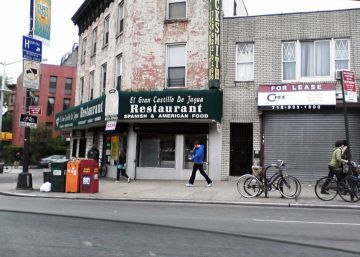 Calle de Nueva York con rótulos publicitarios en español. En vídeo, el acto en el Instituto Cervantes. INSTITUTO CERVANTES / EPV