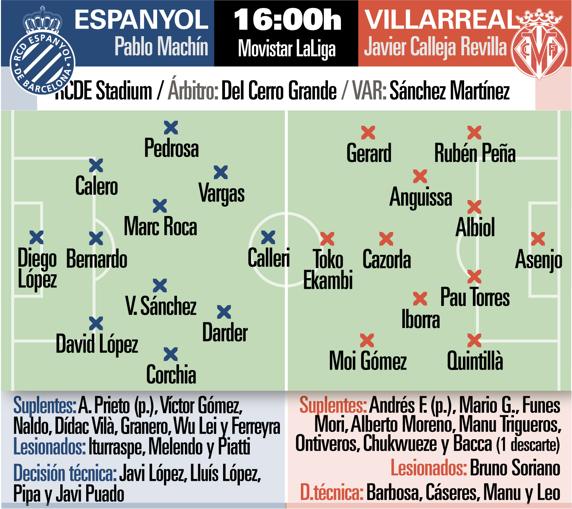 Casi dos semanas más tarde de hacerse cargo de la nave perica, Pablo Machín se estrena este domingo (16.00 horas) como técnico del Espanyol en la visita del Villarreal al RCDE Stadium. La intención del técnico soriano y de todo el espanyolismo pasa por torpedear al ‘submarino amarillo’ y lograr el que sería el primer triunfo del Espanyol como local en lo que va de Liga. Pero el cuadro visitante, con el experico Gerard Moreno (que el pasado martes debutó con España) y el rejuvenecido Cazorla al frente, quiere resarcirse del triunfo que sufrió ante Osasuna antes del parón.