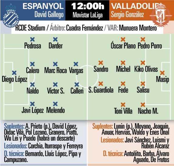 En cuanto al Valladolid, no tiene un margen de error mucho mayor que el del Espanyol. Tras arrancar la Liga con triunfo ante el Betis en el Benito Villamarín (1-2), el conjunto blanquivioleta ha encadenado cinco partidos sin ganar y tan solo tiene un punto más que el cuadro perico. Con la sensible baja de Rubén Alcaraz por molestias musculares, Sergio, aunque perico de corazón, hoy hará todo lo posible para frustrar a su Espanyol.