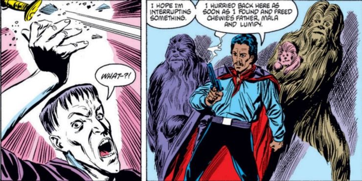 en el 91S tnúmero de Marvel Guerra de las Galaxiasde Mary Jo Duffy y Tony Salmons, la familia de Chewbacca y el planeta Kashyyk de El especial navideño de Star Wars aparecer una vez más. Ambientada durante la Guerra Nagai-Tof menos de un año después El regreso del Jedi, el problema tiene a Han Solo, Chewbacca y Lando Calrissian frustrando un complot siniestro de los nagai para esclavizar a los wookiees. Mala, Lumpy y Itchy (la esposa, el hijo y el padre de Chewbacca, respectivamente) aparecen como lo hicieron en el Especial de vacaciones, dejando en claro que el extraño programa de variedades es una parte canónica de la franquicia en ese momento. Mientras que Marvel Guerra de las Galaxias Los cómics, como el resto del Universo Expandido, se convirtieron en una línea de tiempo alternativa con la adquisición de Lucasfilm por parte de Disney, la continuidad del canon en curso hace referencia a la Especial de vacaciones también.