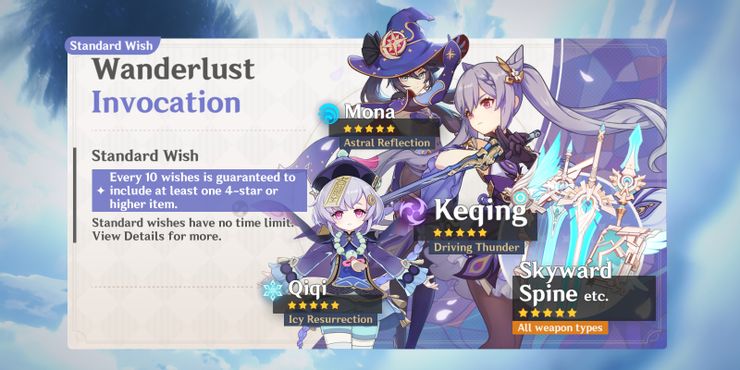 Con el sistema gacha siendo un mecánico principal en Impacto Genshin, hay tres estandartes que están disponibles para que los jugadores los usen: el estandarte de personaje de ejecución limitada y el estandarte de arma de invocación de epítome, los cuales se alternan repetidamente con nuevos personajes y armas, y el estandarte de personaje estándar de invocación de Wanderlust. Actualmente, la tirada limitada Impacto Genshin Banner presenta a Kamisato Ayato y Venti, y se espera que aparezcan aún más personajes con nuevas actualizaciones. Mientras tanto, el personaje estándar Banner siempre ha presentado el mismo conjunto de personajes de cinco estrellas desde el lanzamiento del juego a fines de 2020: Keqing, Mona, Qiqi, Diluc y Jean, así como las armas estándar de cinco estrellas.