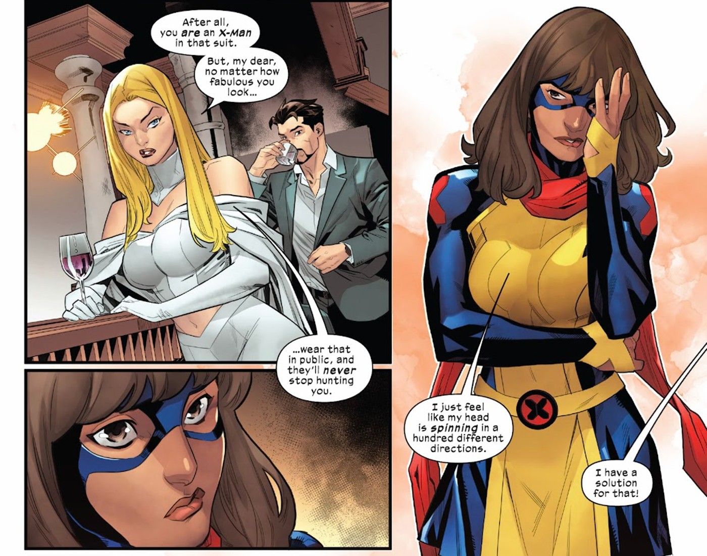 Emma Frost advierte al joven héroe, sugiriendo que agitar con orgullo su nueva bandera mutante es peligroso. Esto enciende a Kamala, lo que la lleva a preguntarse si no lo hizo público lo suficiente, convencida de que es una prueba viviente de que personas de diferentes orígenes deberían poder vivir libremente en el mismo espacio. “Soy un inhu-mutante paquistaní-estadounidense,“, grita con orgullo. “¡Soy literalmente una prueba viviente de que todos podemos coexistir!” Aunque Frost rápidamente apaga el idealismo de Kamala, su perorata contribuye en gran medida a resaltar cómo convertirse en mutante ha contribuido a su carácter. La historia de Kamala, en esencia, siempre ha sido acerca de cómo ella aprende a sentirse cómoda consigo misma.
