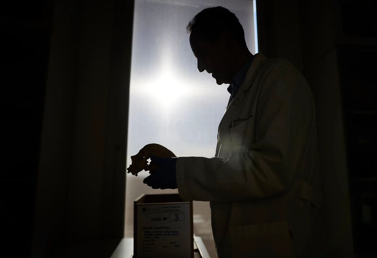 El doctor José Antonio Lorente manipula un cráneo de los restos óseos atribuidos a Cristóbal Colón que se guardan en la Facultad de Medicina de Granada.