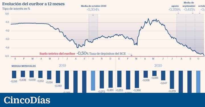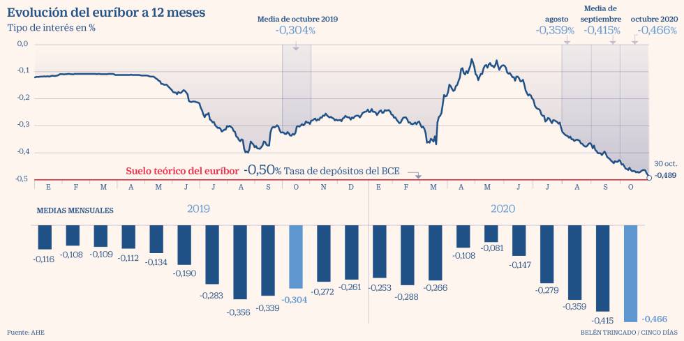 Los riesgos por el Covid-19 van en aumento pero la cotizacion del euríbor a 12 meses sigue disminuyendo. El índice cierra octubre con una media del -0,466% y marca su tercer mínimo histórico mensual consecutivo, por debajo del -0,415% de septiembre y del -0,359% de agosto. El indicador más utilizado en España para calcular las hipotecas a tipo variable ha llegado a hundirse hasta el -0,489% en tasa diaria hoy mismo. Las inyecciones de liquidez del Banco Central Europeo (BCE) están detrás de la caída en picado del euríbor que, de acuerdo con los expertos, se mantendrá en niveles negativos durante varios años más aunque no debería irse mucho más abajo. Los analistas sitúan su suelo teórico en el -0,5% que coincide con la tasa de depósitos del BCE, pero advierte que su evolución dependerá de la estrategia que mantenga en el futuro el organismo que dirige Christine Lagarde.