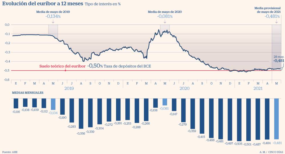 El euríbor a 12 meses, el índice al que se encuentran referenciadas la mayoría de las hipotecas españolas, sube en mayo por cuarto mes consecutivo y sitúa la media provisional en el -0,481% (a falta del dato del lunes). El ascenso, no obstante, es ligero frente al -0,484% de abril y desde su mínimo histórico mensual del -0,505% registrado en enero. Pese a continuar la tendencia alcista iniciada en febrero, hace justo un año el indicador estaba mucho más alto y casi rozaba el umbral del cero (-0,081%) por las tensiones derivadas de la pandemia. Esto supone que las hipotecas en revisión experimentarán una notable rebaja en sus cuotas. En concreto, para una hipoteca media de 150.000 euros a 30 años la cuota bajará en unos 25 euros al mes o 300 euros al año.