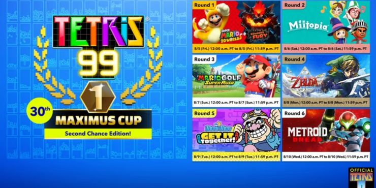 El 30.º evento de la Copa Maximus comienza el 5 de agosto y brinda a los jugadores la oportunidad de desbloquear el Super Mario 3D World + Furia de Bowser tema escénico. El 6 de agosto, los jugadores pueden ganar el Miitopía Tetris 99 escenario, el 7 de agosto, los jugadores pueden ganar el Mario Golf: Super Rush Tetris 99 el tema del escenario, y el 8 de agosto, los jugadores pueden ganar La leyenda de Zelda: Skyward Sword HD Tetris 99 tema escénico. Los últimos dos días del evento comienzan el 9 de agosto, cuando los jugadores pueden ganar el WarioWare: Consíguelo Tetris 99 tema escénico; y concluye el 10 de agosto, cuando los jugadores pueden ganar el Metroid Terror Tetris 99 tema escénico.