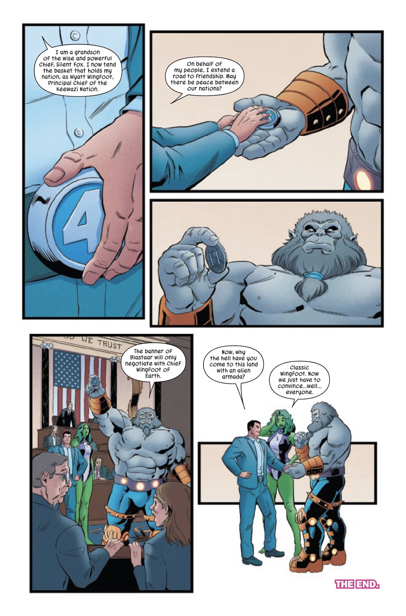 En La sensacional She-Hulk #2 Historia adicional, escrita por Bobby Wilson con arte de David Cutler y Dee Cunniffe, Jen actúa como abogada del jefe Keewazi Wyatt Wingfoot en una audiencia en Washington, DC De repente, el Capitolio de los Estados Unidos es atacado por el guerrero de la Zona Negativa conocido como Blastaar. Wyatt, ex prometido de Jen y mejor amigo de Johnny Storm desde hace mucho tiempoEs un hombre muy atlético, pero no tiene superpoderes. Reed Richards le regaló un cinturón que le otorga algunas capacidades defensivas, que utiliza para proteger a otros de los ataques de Blastaar. Jen, con la esperanza de que los dos ayuden a la gente a evacuar, advierte a Wyatt que deje de intentar hablar con su enemigo, calificando sus acciones como “es un buen día para morir” rutina.