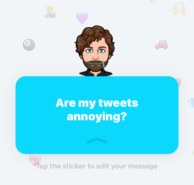 La premisa básica de Yolo es que escribes una pregunta como “¿Quién se parece a mi celebridad?”, “¿Qué piensa realmente la gente de mí?” o “¿Cómo podría ser más amable?”. Luego te cambias a Snapchat, donde puedes publicar la pregunta en tu Historia o mensajes con un enlace de regreso a Yolo. Allí, las personas pueden dejar una respuesta anónima; puedes publicar eso y tu respuesta con otra publicación en Snapchat.
