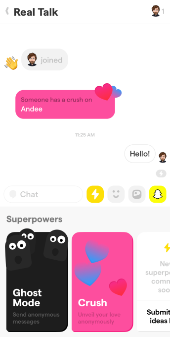 Lo que hace que esto sea especial es que una vez por hora, los usuarios pueden tocar el botón Superpoderes de Yolo para enviar un mensaje totalmente anónimo al grupo. Vienen más superpotencias, pero también hay un anónimo “Alguien está enamorado de [name]”Para que pueda profesar secretamente su afecto a cualquier persona u otra persona en el chat.