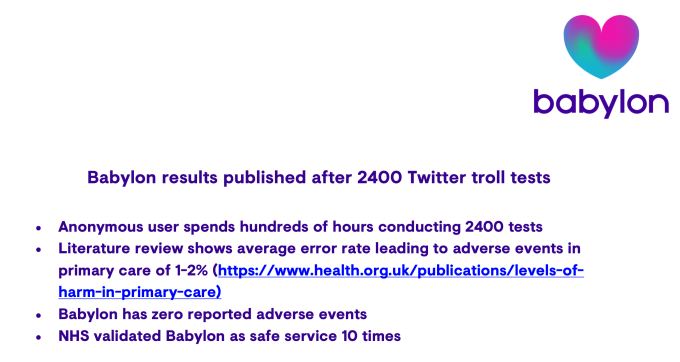 En el caso de Babylon, argumenta que la compañía no ha podido respaldar el marketing hinchado con evidencia del tipo de pruebas clínicas y validación extensas que, según él, deberían ser necesarias para que los pacientes utilicen una aplicación de salud en la naturaleza. (Las referencias a los estudios académicos no se han sostenido al proporcionar a los extraños acceso a los datos para que puedan verificar sus afirmaciones, también dice).