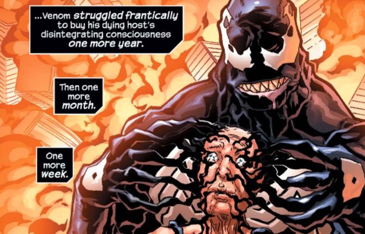 A menudo se dice que la vida es la suma total de todas las experiencias pasadas. Cuando se ve de esa manera, el método que usa Venom para mantener vivo a Eddie en realidad lo está matando de una manera diferente al borrar lentamente estas experiencias. Si bien esto es lo suficientemente perturbador, además de esto, Eddie parece estar sufriendo todo el tiempo. Él es esencialmente una cáscara vacía a lo largo de este proceso, pero parece haber sufrimiento en sus ojos y su boca está congelada en un grito silencioso. Como señala la narración del cómic, Eddie se mantiene con vida, lo quiera o no. Y por lo que parece, parece que ciertamente no lo hace.